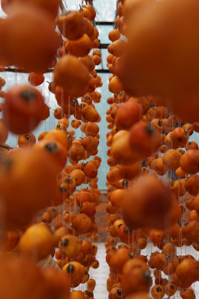 秋に収穫して、冬の乾燥した時に干すので冬の食べ物というイメージがあると思います。また、お正月飾りに鏡餅を飾ると思いますが、そこに干し柿も一緒に飾る地域があると思います。